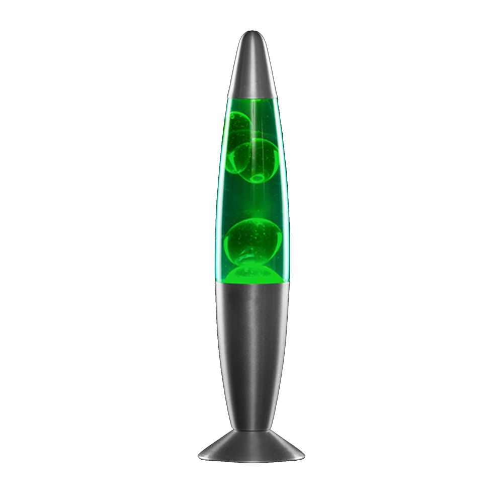 La lampe à Lave Magma Rocket avec des bulles vertes dans un liquide bleu.